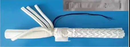 一體化免縫合帶支架人工血管系統(tǒng)包括人工血管和免縫合扣帶兩部分,通過(guò)主動(dòng)脈覆膜支架進(jìn)行腔內(nèi)修復(fù),一般由股動(dòng)脈導(dǎo)入,到達(dá)病變部位后釋放支架,支架撐開(kāi)后固定在主動(dòng)脈內(nèi)壁,將病變血管覆蓋,重建安全通路,恢復(fù)血流循環(huán)。