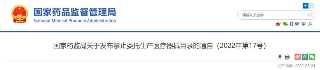 為加強醫(yī)療器械生產(chǎn)監(jiān)管,保障醫(yī)療器械安全、有效,根據(jù)《醫(yī)療器械監(jiān)督管理條例》(國務院令第739號),國家藥品監(jiān)督管理局組織修訂了《禁止委托生產(chǎn)醫(yī)療器械目錄》,現(xiàn)予發(fā)布,自2022年5月1日起施行,原國家食品藥品監(jiān)督管理總局《關于發(fā)布禁止委托生產(chǎn)醫(yī)療器械目錄的通告》(2014年第18號)同時廢止。特此通告。