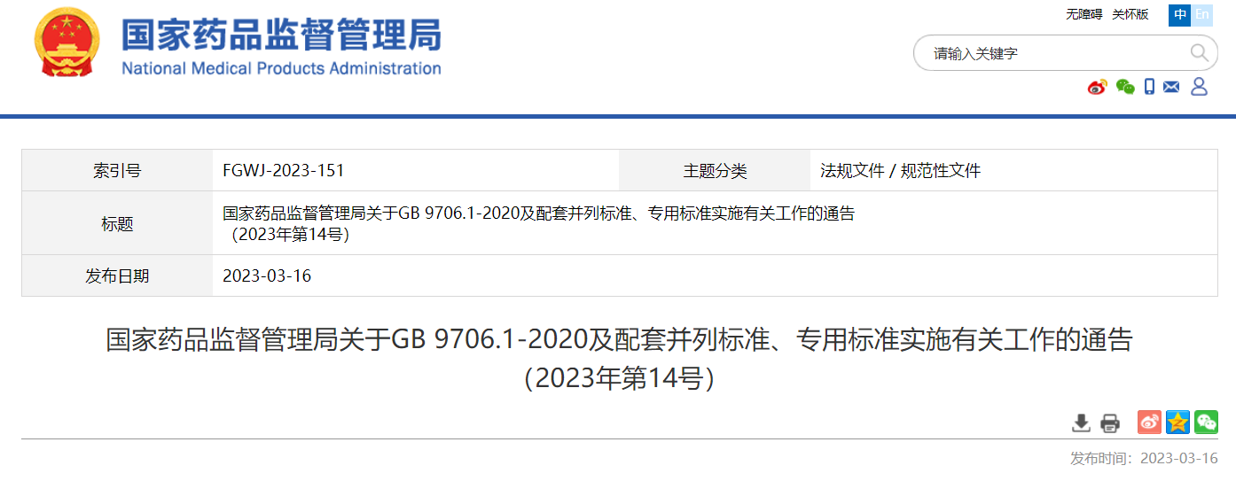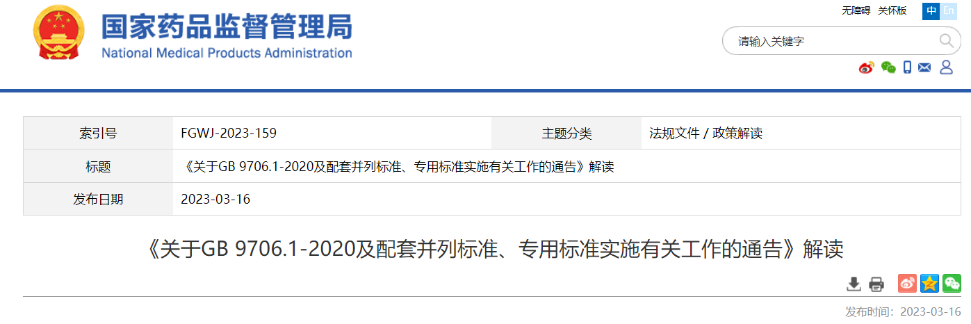 近日,國(guó)家藥監(jiān)局發(fā)布《關(guān)于GB 9706.1-2020及配套并列標(biāo)準(zhǔn)、專用標(biāo)準(zhǔn)實(shí)施有關(guān)工作的通告》(2023年第14號(hào),以下簡(jiǎn)稱通告)。現(xiàn)就通告出臺(tái)的背景、相關(guān)內(nèi)容說(shuō)明如下: