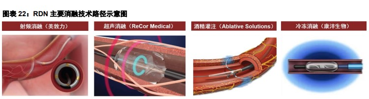 腎交感神經(jīng)過度興奮可使血壓上升,高血壓死亡風(fēng)險(xiǎn)高、治療負(fù)擔(dān)重,盡管已上市降壓藥物眾多,但仍存在大量藥物依從性差及耐藥患者。經(jīng)腎動(dòng)脈去交感神經(jīng)術(shù)(RDN)是指通過介入治療方法(經(jīng)股動(dòng)脈、橈動(dòng)脈),破壞腎交感傳入和傳出神經(jīng),減弱腎和全身交感神經(jīng)活動(dòng),從而降低血壓,實(shí)現(xiàn)一次微創(chuàng)手術(shù)長(zhǎng)期平穩(wěn)降壓。RDN技術(shù)已經(jīng)歷10余年發(fā)展,可基于射頻消融、超聲消融、冷凍消融、化學(xué)消融等方式,其中主要以射頻消融(rRDN)和超聲消融(uRDN)為主導(dǎo)。