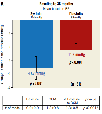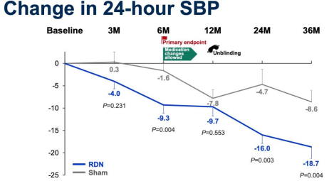 △ 試驗(yàn)結(jié)果:36個(gè)月的隨訪資料顯示,當(dāng)兩組使用了治療強(qiáng)度相似的抗高血壓藥物時(shí),RDN組動(dòng)態(tài)收縮壓降幅顯著高于假手術(shù)組,RDN治療與Sham相對(duì)比,顯著降低患者血壓可達(dá)3年,且無安全性問題,這一療法可作為高血壓患者藥物治療的替代方案。