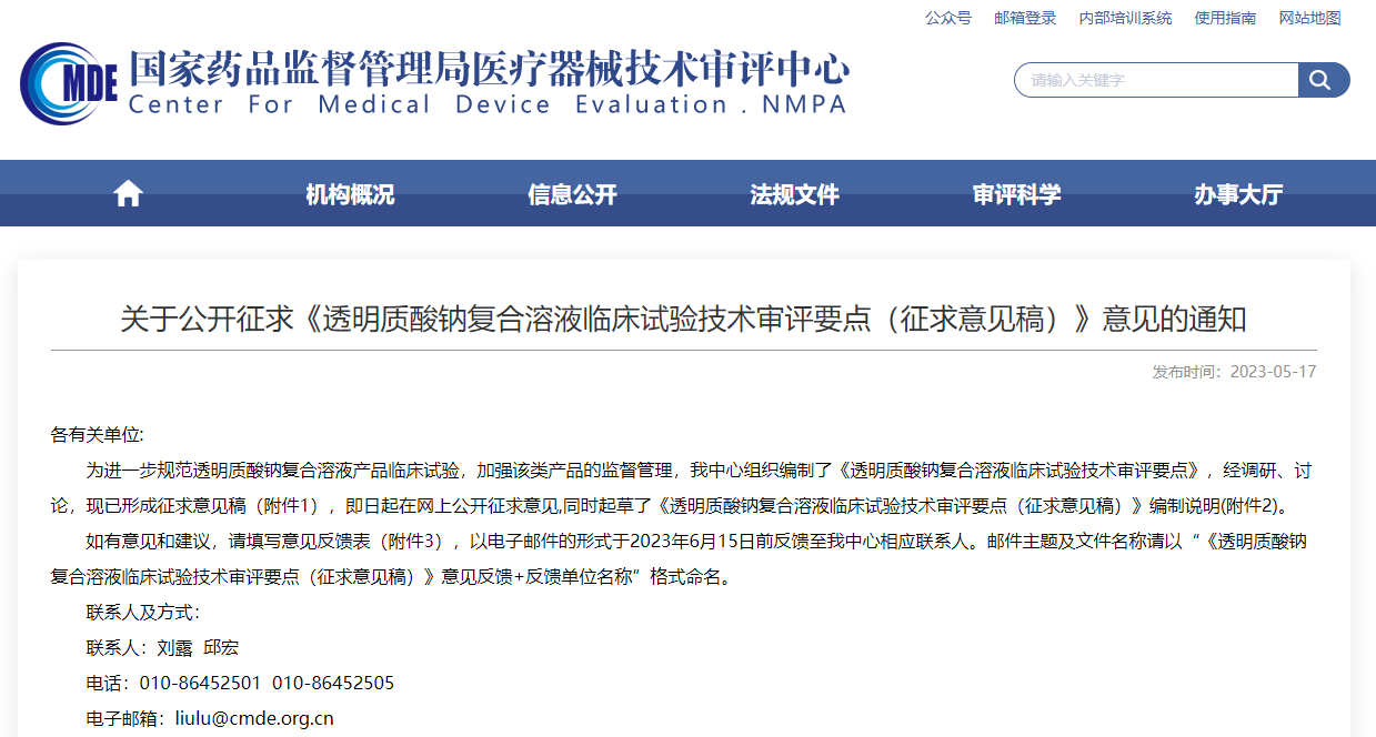 ▲ 《透明質(zhì)酸鈉復(fù)合溶液臨床試驗技術(shù)審評要點(征求意見稿)》 (來源:器審中心)