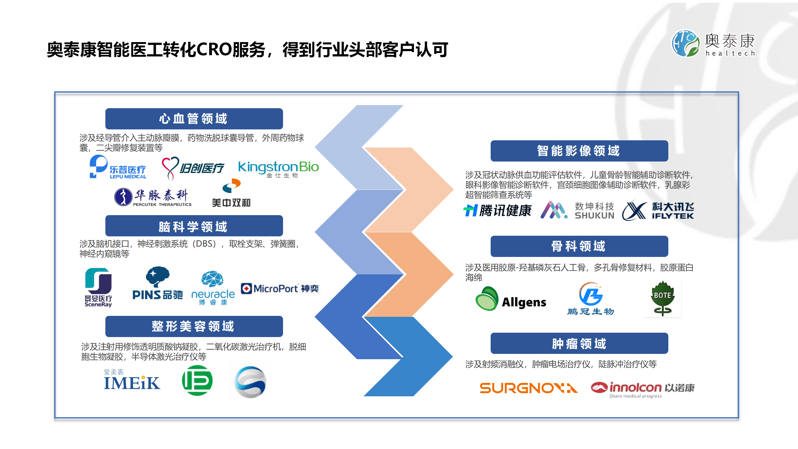 奧泰康始終以臨床需求為導(dǎo)向,依托CRO&CDMO一體化服務(wù),以服務(wù)技術(shù)創(chuàng)新為引領(lǐng),在以心腦血管、神經(jīng)介入、人工智能、醫(yī)美整形、骨科、腫瘤等為主的多個(gè)臨床應(yīng)用領(lǐng)域持續(xù)發(fā)軔,通過(guò)提供時(shí)效性強(qiáng)、成本可控、質(zhì)量有保障和專業(yè)性的全流程解決方案,持續(xù)推動(dòng)安全、有效和質(zhì)量可控的產(chǎn)品進(jìn)入市場(chǎng),推動(dòng)臨床科技成果轉(zhuǎn)化落地。
